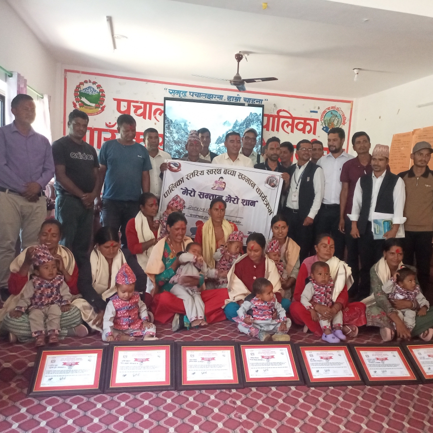 केशव शाही / कालीकोट । पचालझरना गाउँ पालिका स्वास्थ्य शाखा काे आयाेजनामा पालिका स्तरिय स्वस्थ बच्चा सम्मान कार्यक्रम गरेको छ । गाउँ पालिकाले ” मेराे सन्तान मेराे सान ” भन्ने मुल नाराका साथ भएको कार्यक्रममा पचालझरना गाउँ पालिका भित्रका वडा नम्बर १ देखि वडा नम्बर ९ सम्मका ९ जना सुनौलो हजार दिनका आमाहरुलाई सम्मान सहित प्रशंसा प्रत्र बितरण गरिएको हो । बिगत देखिनै याे कार्यक्रम लाई निरन्तरता दिदै आईरहेको भएपनि यस वर्ष समानित गरिएको हो । सो कार्यक्रमका प्रमुख अतिथि अध्यक्ष शाहीले परिवार र सरकारकाे दाेहाेराे जिम्मेवारीबाट मात्र बालबालिकाे भबिस्य निर्माण हुने भएकाले सबैले सचेत हुनु पर्नेमा जोड दिएका छन् ।