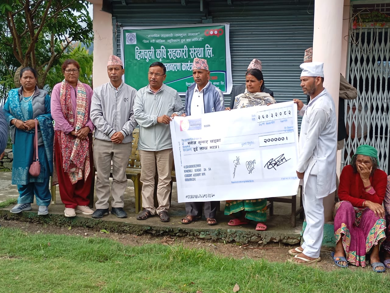 सहकारी संस्थाका अध्यक्ष काली बहादुर महतारा र सल्लाहकार कटक महत सहितको उपस्थितिमा मृतक पाँचा खड्काका परिवार अर्थात श्रीमान मनोज कुमार खड्कालाई राहत हस्तान्तरण गरिएको हो । सहकारी संस्थाका अध्यक्ष काली बहादुर महताराले सहकारीले आफ्ना सदस्यहरुलाई कालगति विमा कार्यक्रम गर्दै आएको र सोही क्रममा सदस्यहरुको उपस्थितिमा राहत हस्तान्तरण गरिएको बताउनु भएको छ । सहकारीले हाल सम्म एक करोड बढि रकम हस्तान्तरण गरिएको बताउदै सबै सदस्यहरुले विमामा आवद्ध हुन आग्रह गर्नु भएको छ ।