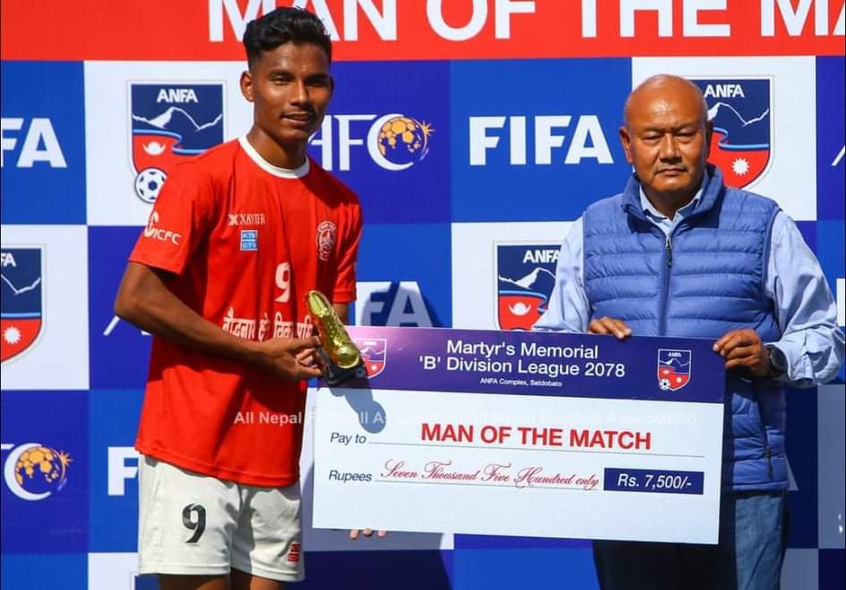 बि’ डिभिजन लिगमा उत्कृष्ट लयमा धिरेन्द्र पहिलो खेलमै उत्कृष्ट प्रदर्शन गर्दै म्यान अफ दि म्याच घोषित
